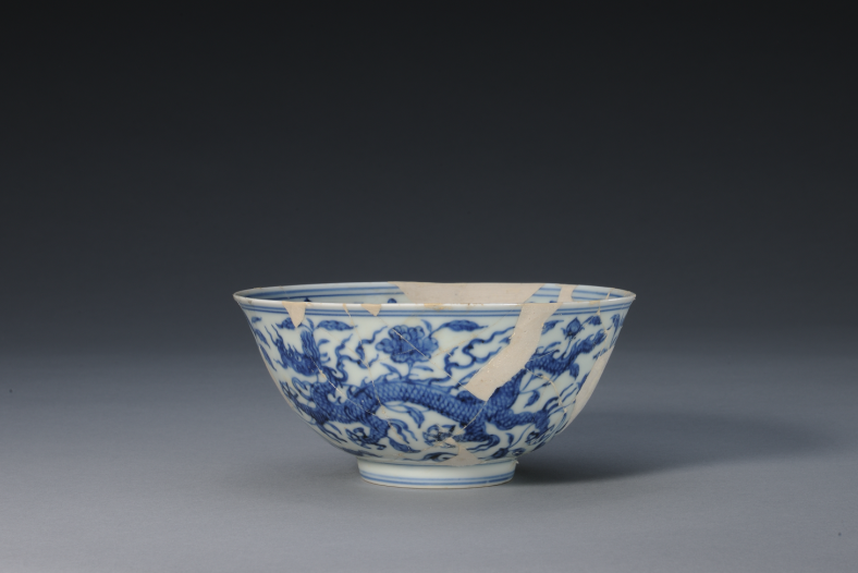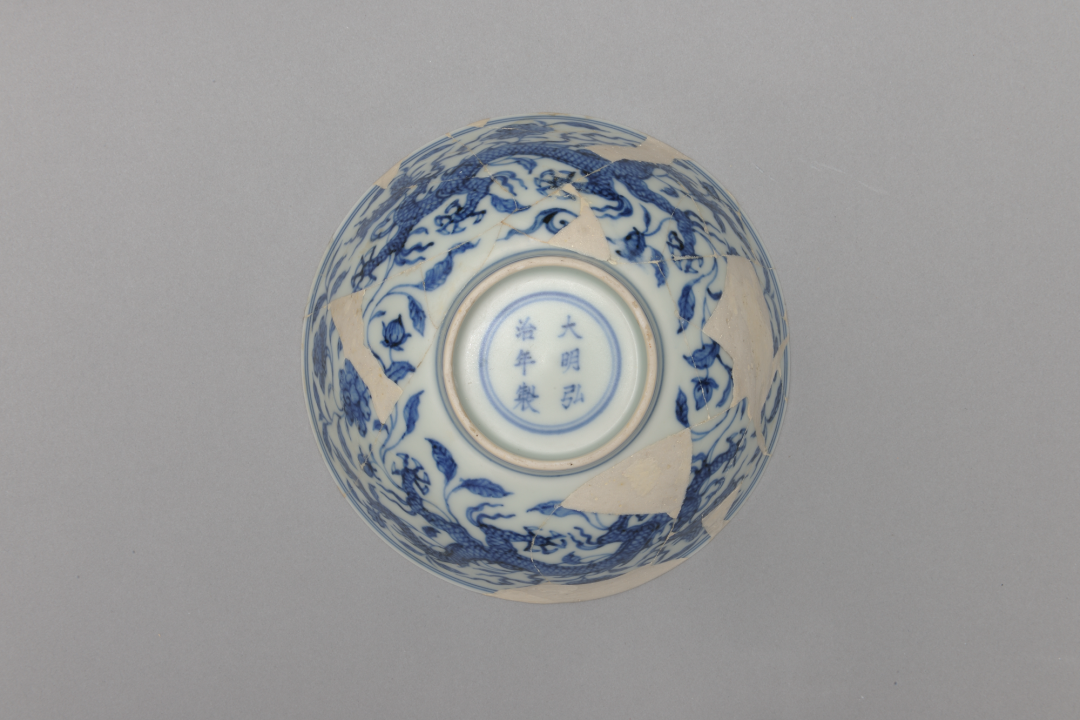 此碗外壁以青料绘两条五爪龙穿绕于芍药花卉之间,圈足外壁饰两条弦纹。碗内为七组莲托梵文。底部用青料书“大明弘治年制”款。
