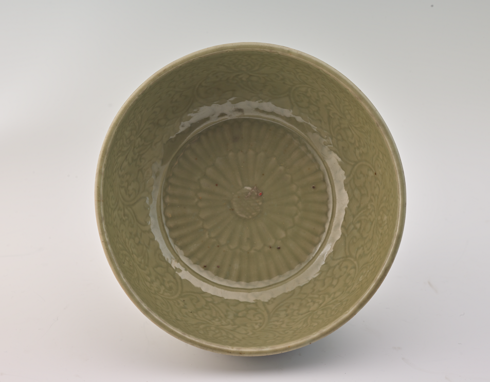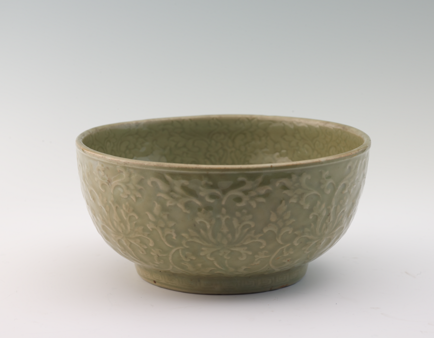 该碗釉色碧绿,刻花工艺精湛,为宫廷在处州定制的龙泉窑官器。据《大明会典》圜丘第一陈设图及相关文献,这类大碗,应是明代皇家重要祭祀用器,是代替登、铏来盛羹的太羹碗及和羹碗。