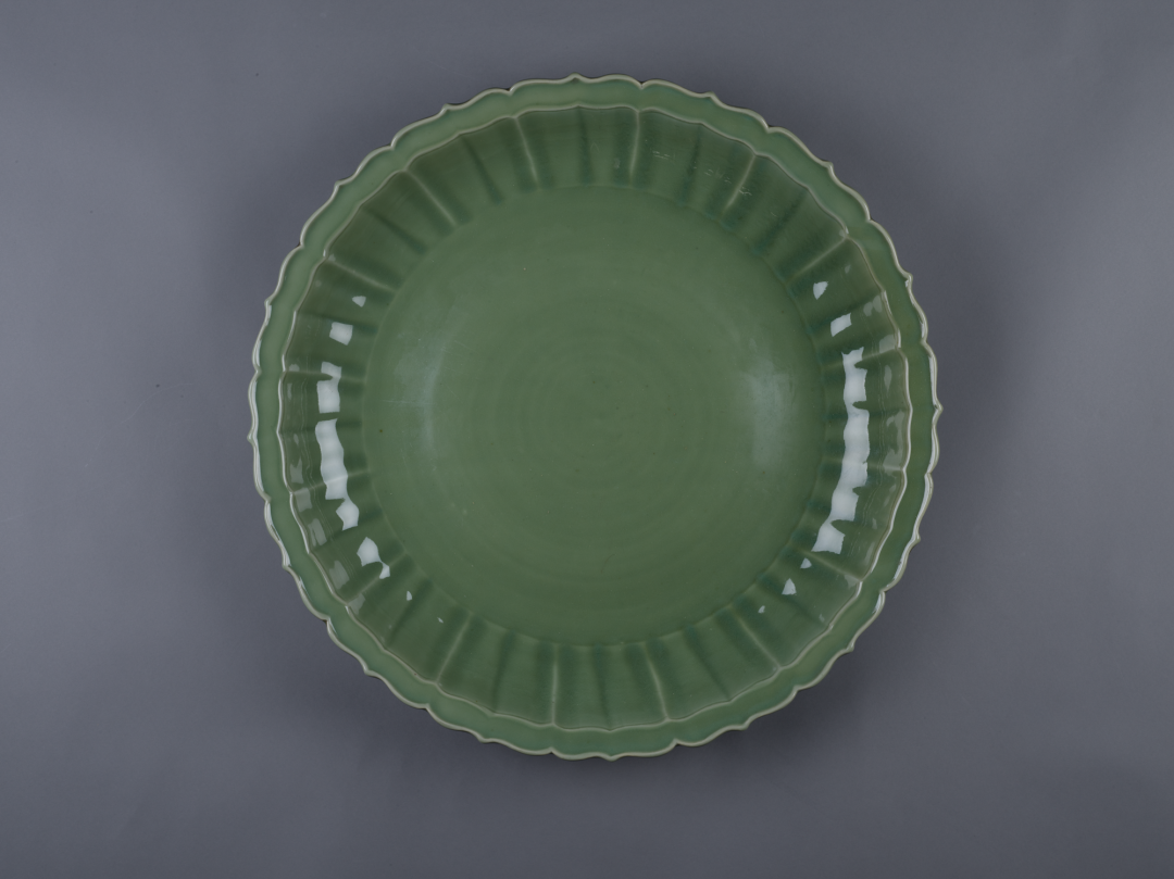 此盘器型硕大,工艺精湛,釉色碧绿莹润,为明初处州龙泉窑官器大盘中难得精品。为宫廷重要祭享场合的礼器。