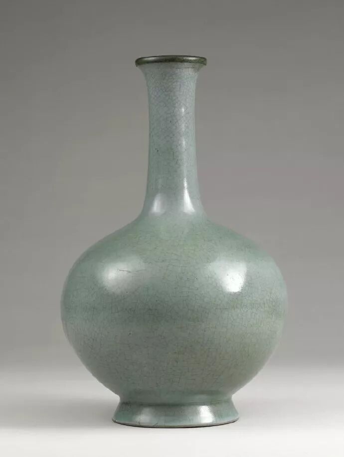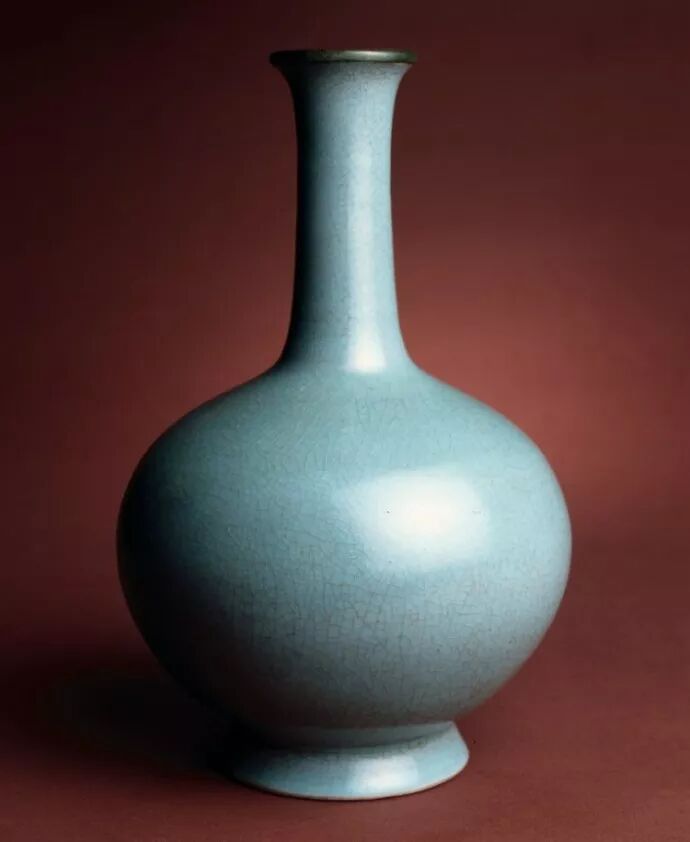 撇口,细长颈,圆腹,底足外撇,瓶口包铜口,天青釉色,表面有细碎开片。全器釉色厚润,线条优美。