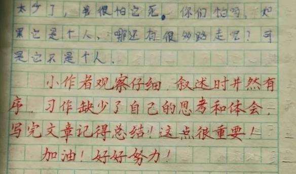 近日,有一位乡村教师批改学生作业,在网上走红,这位女教师不仅反用红笔画出了红色的写得好的重点词句,还在作文的后面,认真地写下了批注。
