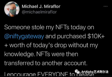 比如,市场和媒体策略师迈克尔·米拉福勒(Michael Miraflor)在加密艺术的热潮中一直在收集NFT。去年3月,有人黑进了他的Nifty Gateway的账户,几分钟时间,他的NFT藏品化为乌有,再也找不回来了。“今天有人在Nifty Gateway上偷了我的NFT,在我不知情的情况下还用数字钱包购买了价值1万美元的新NFT,一并转走了。”他在推特上写道。米拉福勒被盗的NFT最初是由MLB职业艺术家迈卡·约翰逊(Micah Johnson)创建的,他的作品在加密社区中越来越出名。约翰逊曾经在一分钟内售出了价值100万美元的NFT。米拉福勒也在帖子中通知了约翰逊盗窃的事。
