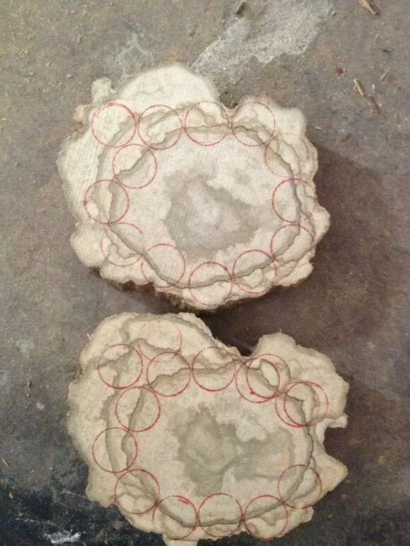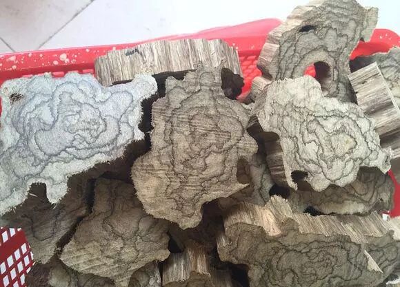 如图,沉香原料一般需要切成一板一板的,然后根据结油状况来画圈选料。![]()