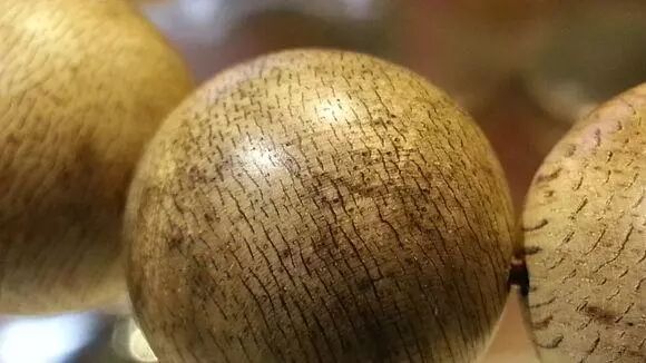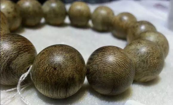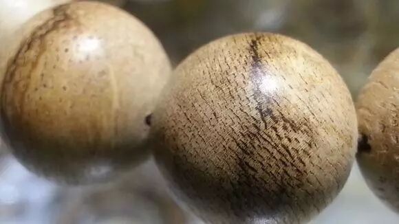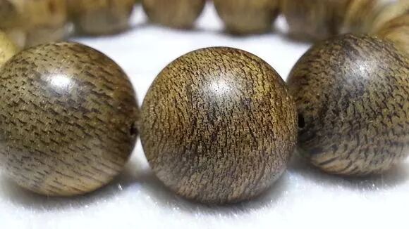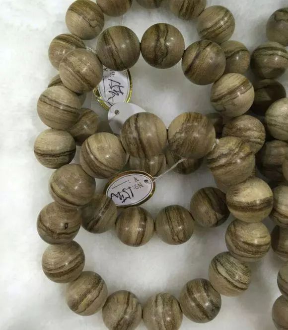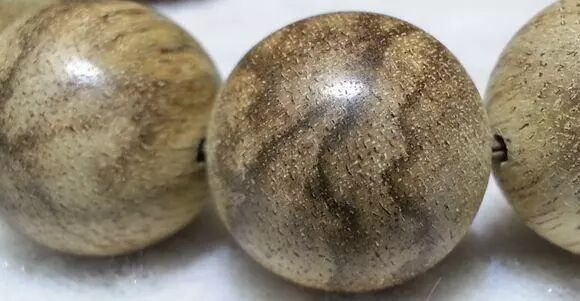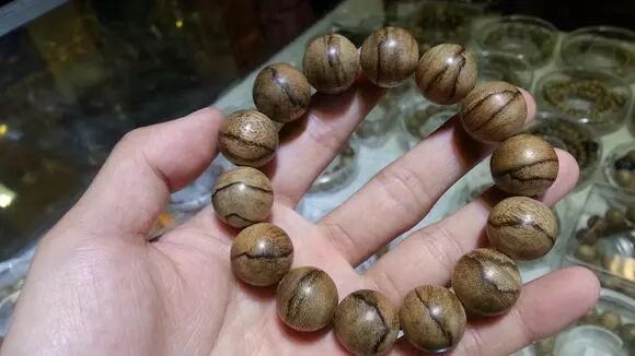 上图为一块柬埔寨产区的沉香,熏材类型,花果蜜香极具穿透力,上炉后味道更是富有层次感,那一条条长长的油线很美观,制珠后一般是什么样呢?![]()