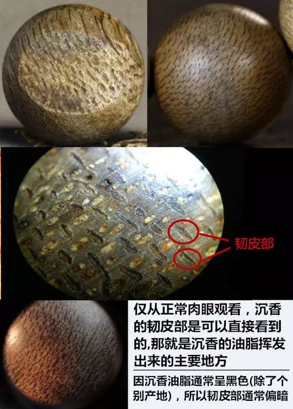 不管是任何一种形态,沉香的美,都是一种惊艳,我们可以看到制珠后有一条条细细长长的毛孔洞,他的学术名即为“韧皮部”,下面再上一张图,方便看得懂:![]()