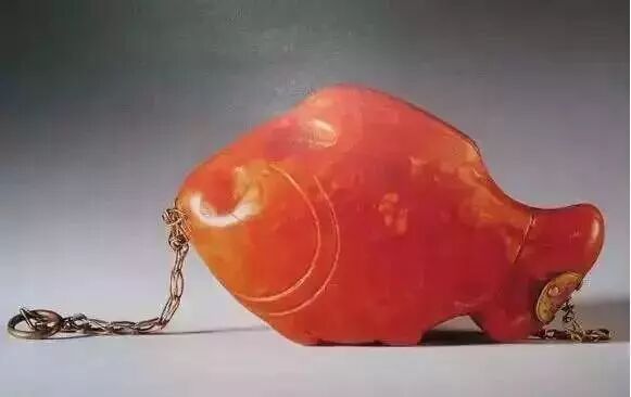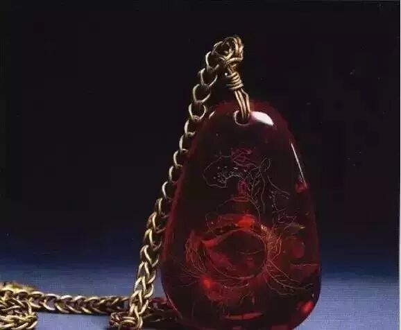 该饰物是以一条金链下系一块水滴状琥珀,琥珀为鲜红色,色泽艳丽通明,内部有一个气泡,聪明的匠师奇妙有利地势用了资料上的这一点小小的瑕疵,在琥珀的外壁依气泡的形状阴刻了两颗仙桃,衬以枝叶,显得清新自然,另一面则阴刻“瑶池春熟”四字,笔触洒脱潇洒。这件饰物既能够日常佩带,也能够闲暇时赏玩,和琥珀杯相同,都是墓主人生前的爱物。![]()