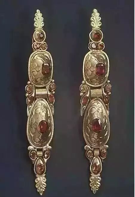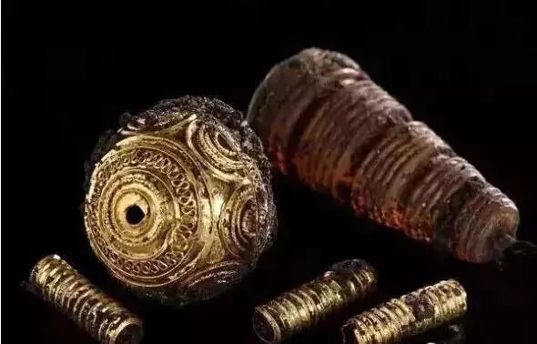 凯尔特人黄金首饰(图片来历:Stuttgart Regional Council)在一座古代凯尔特贵妇墓穴内发现的黄金首饰。这是一座木椁墓,里面的骸骨距今2600年。这名贵妇逝世时的年龄在30岁到40岁之间,她出身高贵,陪葬品包含一系列做工精良的珠宝首饰,例如镶嵌着珍珠的黄金项圈。开棺时,考古人员发现她的腰上佩带着琥珀首饰。古墓开掘负责人表明,这个墓葬的发现证实霍伊内堡是最前期的凯尔特人艺术与文化中心![]()