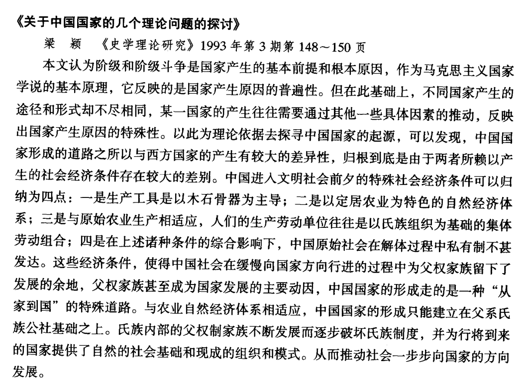梁颖,《史学理论研究》1993年第3期第148~150页本文认为阶级和阶级斗争是国家产生的基本前提和根本原因,作为马克思主义国家学说的基本原理,它反映的是国家产生原因的普遍性。但在此基础上,不同国家产生的途径和形式却不尽相同,某一国家的产生往往需要通过其他一些具体因素的推动,反映出国家产生原因的特殊性。以此为理论依据去探寻中国国家的起源,可以发现,中国国家形成的道路之所以与西方国家的产生有较大的差异性,归根到底是由于两者所赖以产生的社会经济条件存在较大的差别。中国进入文明社会前夕的特殊社会经济条件可以归纳为四点:一是生产工具是以木石骨器为主导;二是以定居农业为特色的自然经济体系;三是与原始农业生产相适应,人们的生产劳动单位往往是以氏族组织为基础的集体劳动组合﹔四是在上述诸种条件的综合影响下,中国原始社会在解体过程中私有制不甚发达。这些经济条件,使得中国社会在缓慢向国家方向行进的过程中为父权家族留下了发展的余地,父权家族甚至成为国家发展的主要动因,中国国家的形成走的是一种“从家到国”的特殊道路。与农业自然经济体系相适应,中国国家的形成只能建立在父系氏族公社基础之上。氏族内部的父权制家族不断发展而逐步破坏氏族制度,并为行将到来的国家提供了自然的社会基础和现成的组织和模式。从而推动社会一步步向国家的方向发展。