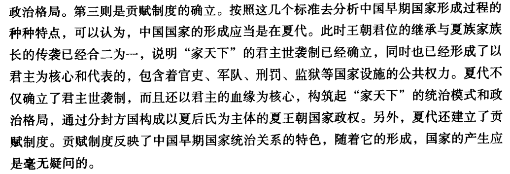本文探讨了中国古代国家形成的标志,认为应该以恩格斯提出的国家形成的两个标志为基点和指导,结合中国的历史实际,找出一个符合中国早期国家特征的综合性衡量标准,这就是古代文献中所说的“家天下”的建立。“家天下”是一个历史的概念,从中国的历史实际看,其本义应当是指某一家族据天下为己私有而对其实施管制,由此构筑起以某一家族和家族长为核心的社会统治模式。这一综合性标准内容是多方面的,主要的并较为客观的有这样几条:是君主世袭制的确立及以君长为核心而形成的公共权力系统,这里“君主世袭制”的确切含义是指家族长的继承与君位的传袭合.二为一。-是以某一家族长的血缘关系为核心和主体构筑起国家的统治模式,即形成“家天下”的政治格局。第三则是贡赋制度的确立。按照这几个标准去分析中国早期国家形成过程的种种特点,可以认为,中国国家的形成应当是在夏代。此时王朝君位的继承与夏族家族长的传袭已经合二为一,说明“家天下”的君主世袭制已经确立,同时也已经形成了以君主为核心和代表的,包含着官吏、军队、刑罚、监狱等国家设施的公共权力。夏代不仅确立了君主世袭制,而且还以君主的血缘为核心,构筑起“家天下”的统治模式和政治格局,通过分封方国构成以夏后氏为主体的夏王朝国家政权。另外,夏代还建立了贡赋制度。贡赋制度反映了中国早期国家统治关系的特色,随着它的形成,国家的产生应是毫无疑问的。