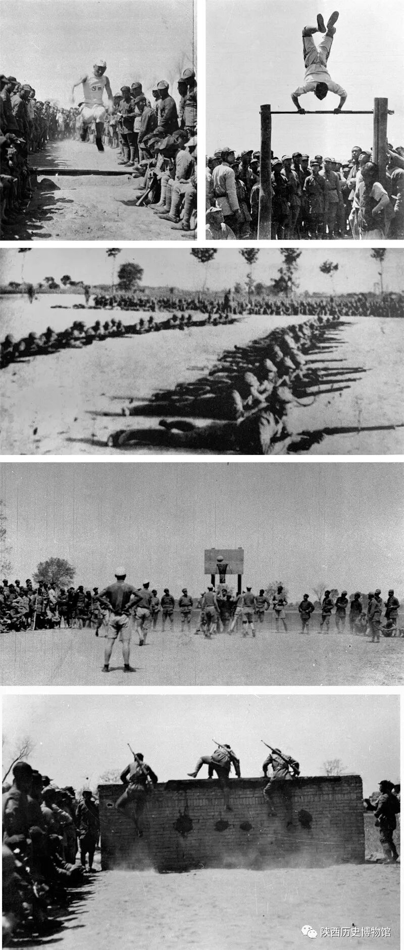 1937年红一方面军在宫河镇举行五一军事体育运动会中的跳远、单杠、射击、篮球、超越障碍比赛。