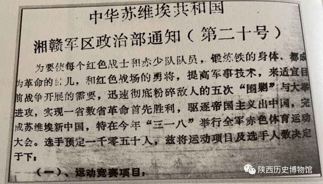 中华苏维埃共和国湘赣军区政治部通知:1934年1月6日,湘赣军区决定于“三一八”在永新举行全军体育运动会。
