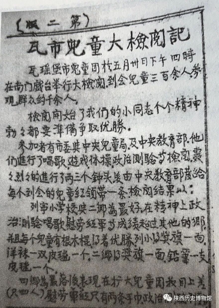 瓦窑堡儿童大检阅:参加检阅儿童三百余人,项目有政治测试、唱歌、游戏和体操等。