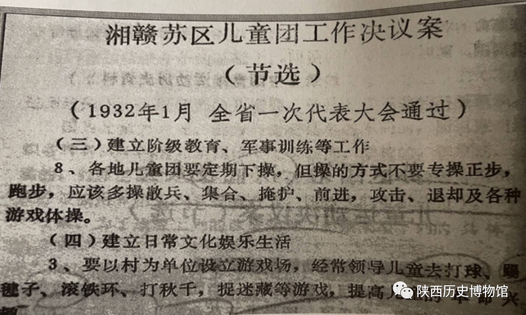 1932年1月的湘赣苏区儿童团工作决案提出:要以村为单位设立游戏场,领导儿童参加打球、踢毽子、滚铁环、打秋千、捉迷藏等。