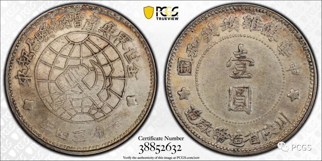 1934年中华苏维埃共和国川陕省造币厂造壹圆银币。该币图文深峻清晰,版底可见版模线,通体原味浅灰色包浆,状态一流,品相十分难得。PCGS评级分数 AU53,估价人民币200000元。