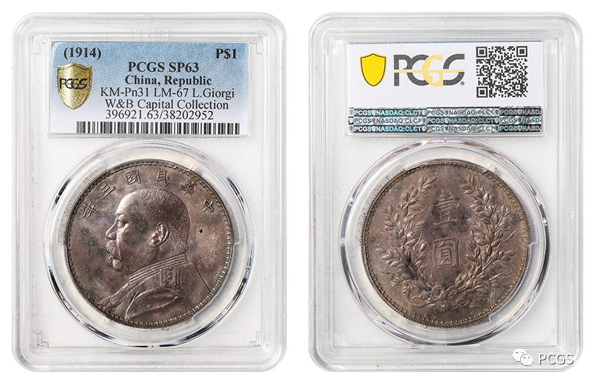 民国三年袁世凯像壹圆“L.GIORGI”签字版银币试铸样币。由天津造币总厂意大利籍雕刻师乔奇设计制模,币面加注其名字,正式铸造时将签名去之,故签名版之“袁大头”壹圆银币留存极为罕见;该枚银币刻模深峻精美,人像生动传神,丝毫毕现,铸造精美,压力十足,镜面底版无伤,海外银灰色原味包浆,侧看反射夺目五彩光泽,十分珍罕。PCGS评级分数SP63,估价人民币1500000元。