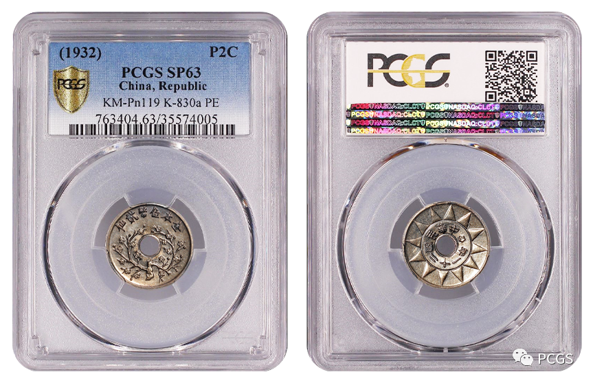 民国二十一年金本位币贰仙镍质样币。光边,美国费城造币厂制模,上海中央造币厂试铸,未发行,极少见;该样币正面梅花、背面党徽,中孔,雕刻精美,铸工精湛,品相一流。PCGS评级分数SP63,估价人民币100000元。