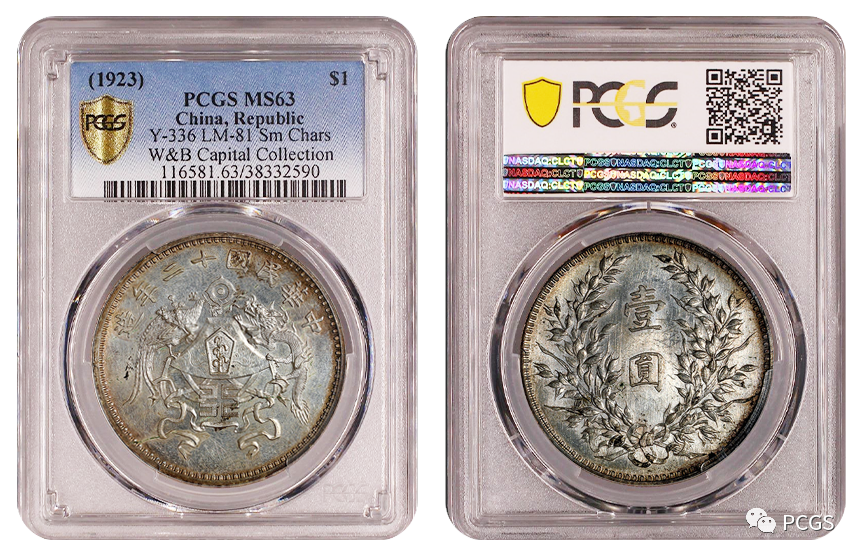 民国十二年造龙凤壹圆银币(小字版)。天津造币总厂铸造,未发行,币面龙凤黼黻图为北洋政府时期制定的国徽图案;该币图案优美,类镜面深打,铸纹清晰,铸造精良,轻薄包浆难掩姣好银光,品相十分难得。PCGS评级分数MS63,估价人民币100000元。