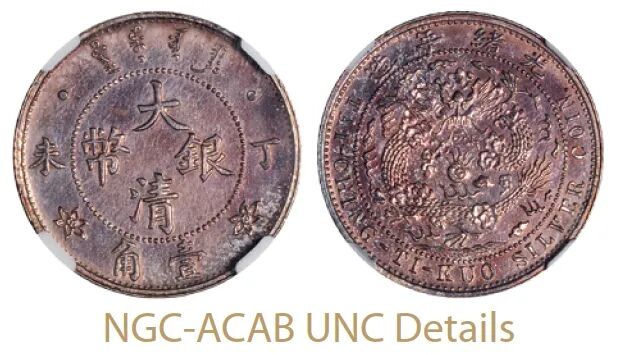 丁未大清银币壹角样币:评级分数为NGC-ACAB UNC Details,2017年拍卖成交价为人民币32200元。1907年丁未大清银币壹角样币为度支部天津造币总厂试铸,未发行,铸额无多,五彩包浆,品相颇佳。