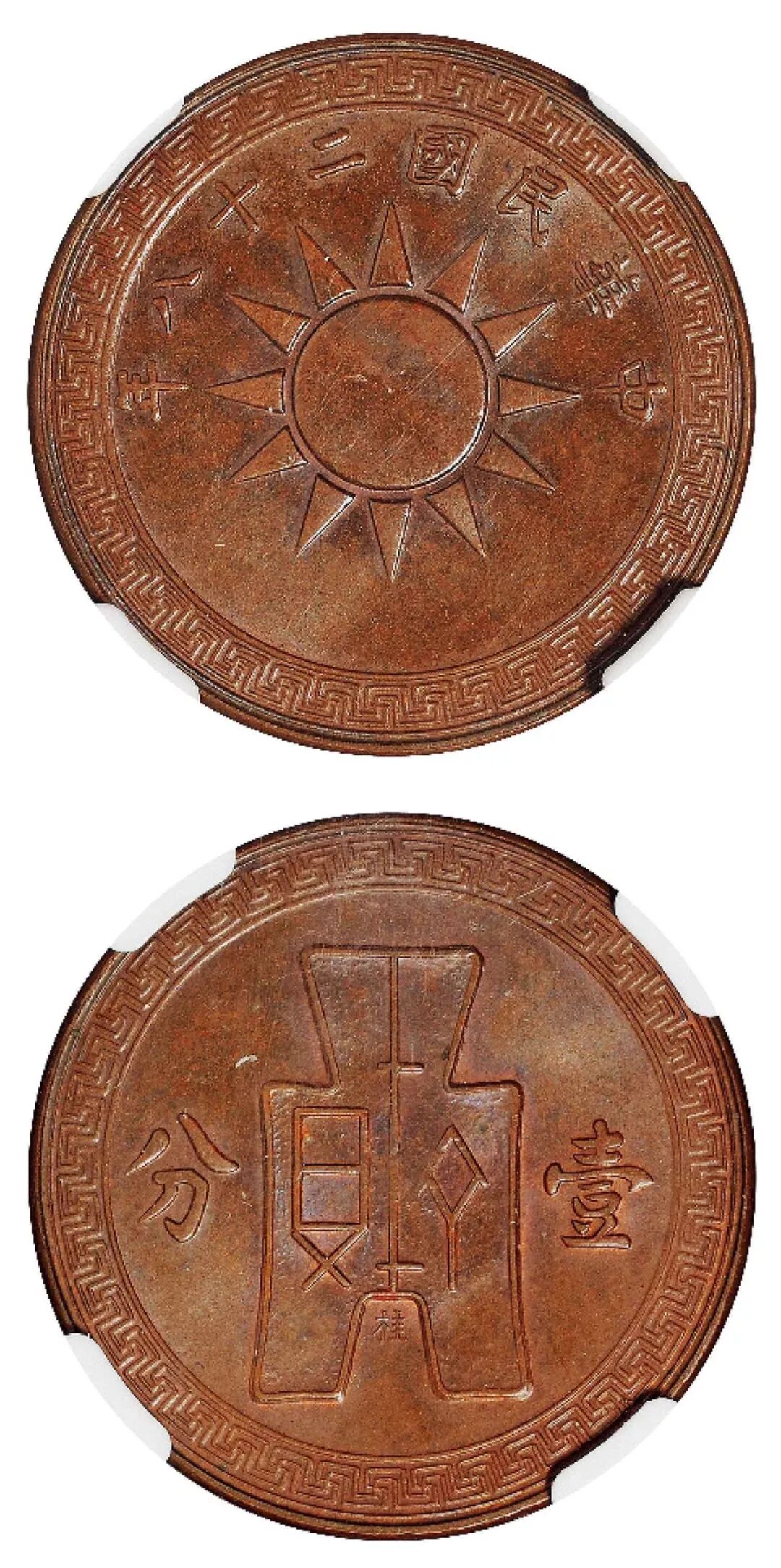 民国二十八年党徽布图大“桂”字壹分红铜样币成交价人民币39100元。民国二十八年党徽布图大“桂”字壹分铜币铸额无多,存世稀少,此枚品相极佳。