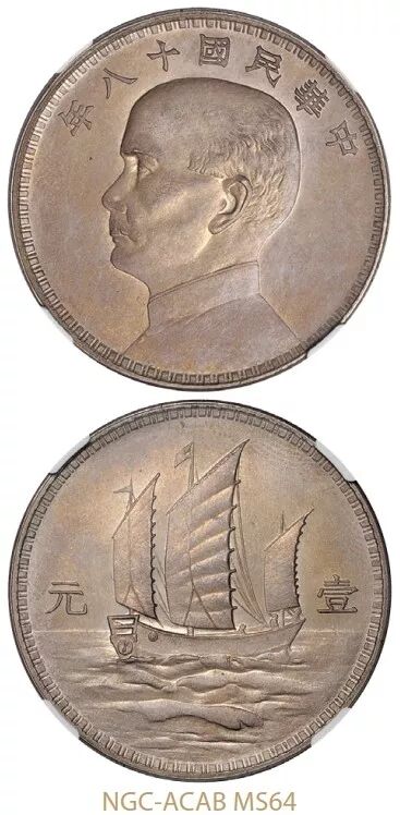 民国十八年意大利版孙中山像背三帆船壹元银币样币成交价人民币172500元。此枚民国十八年意大利版孙中山像背三帆船壹元银币样币雾面银光,版底完美无瑕。