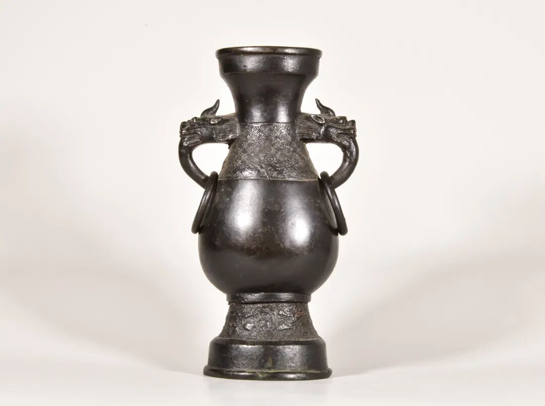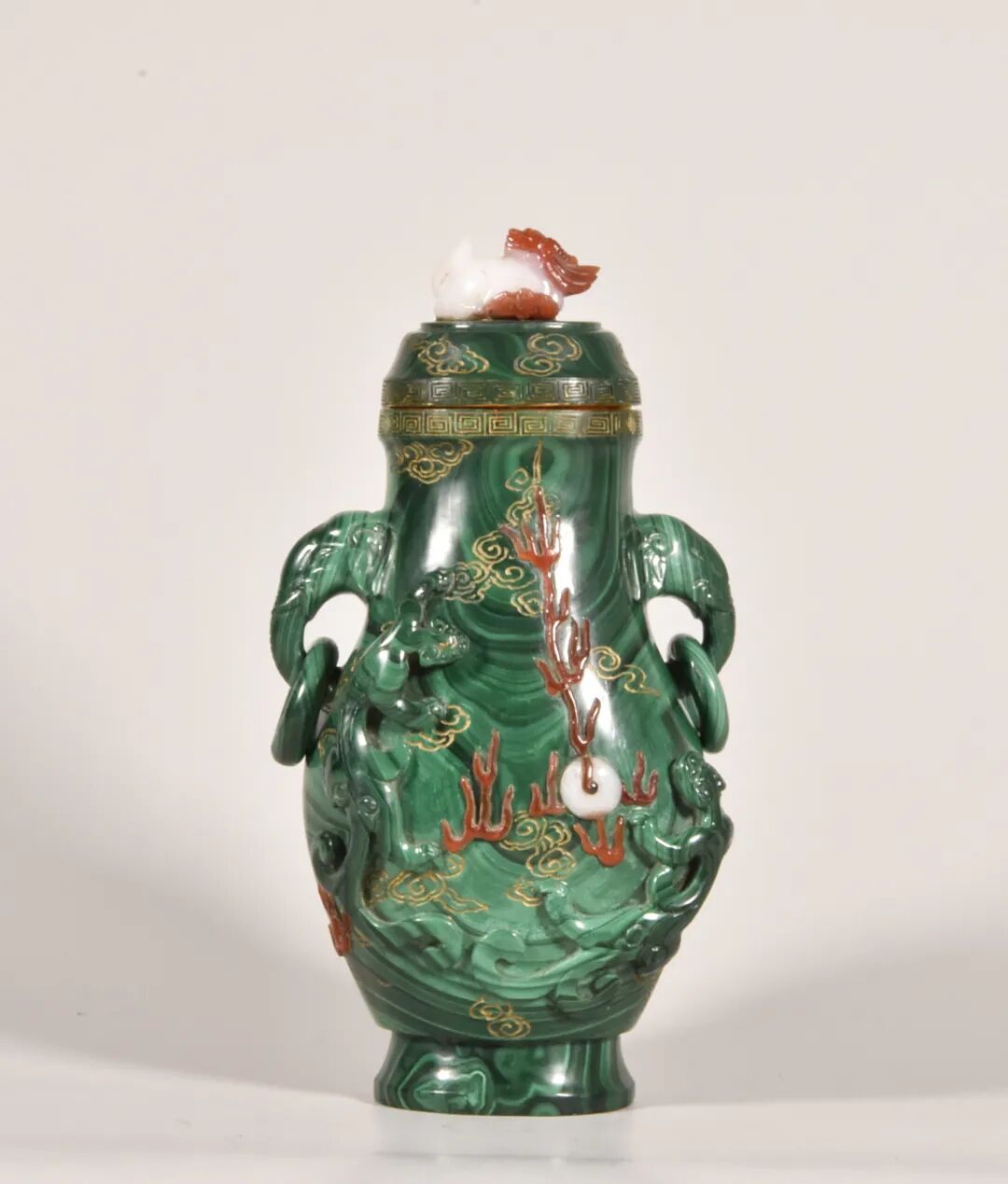 清 孔雀石嵌南红玛瑙浮雕龙纹象耳瓶