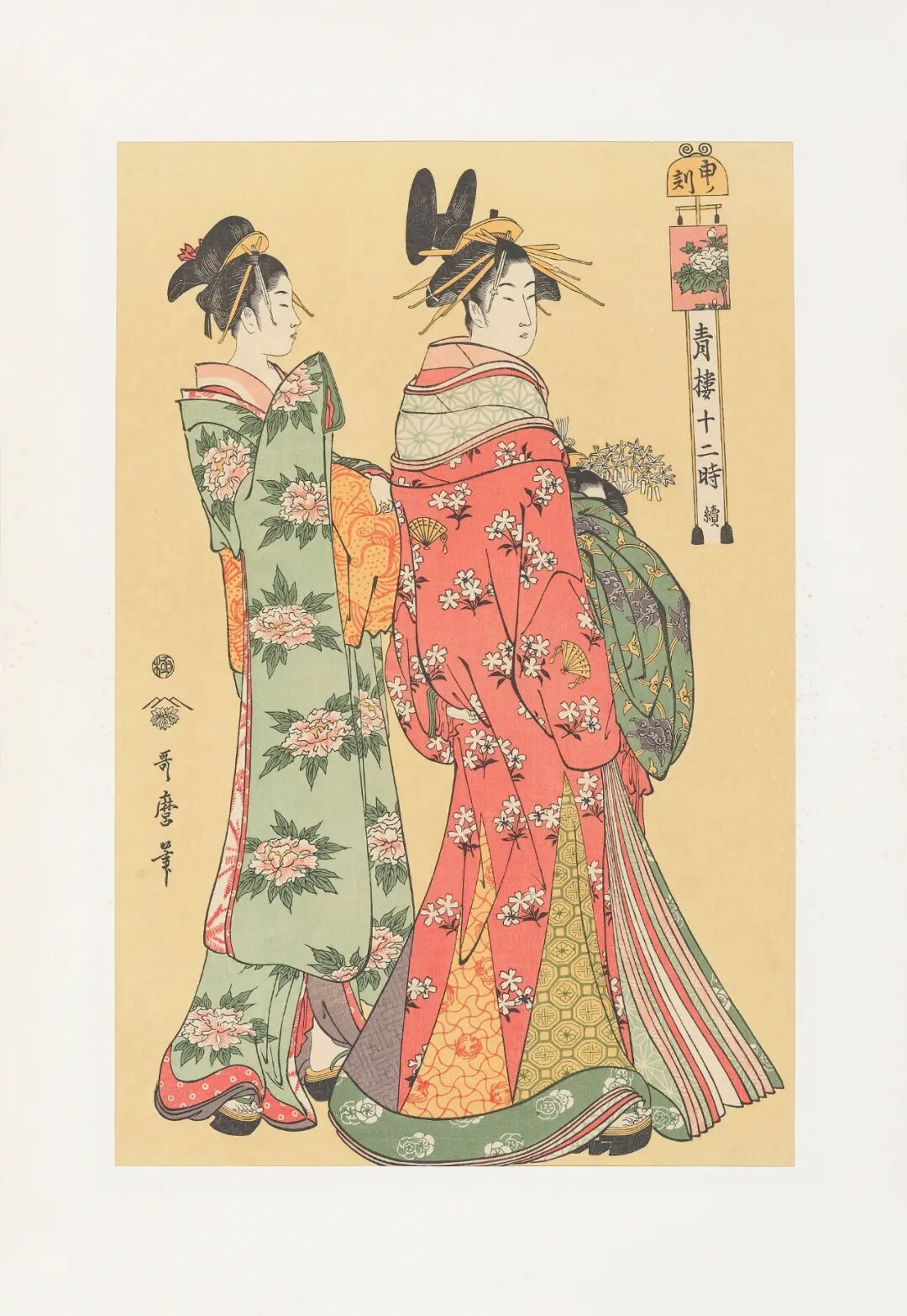 “申之刻”(下午4点)描绘下午4点到吉原开始暮六(下午6点)时候的游女。歌麿擅长追求和表现女性的理想美,在他的笔下女子大约十头身,身姿呈修长,右侧的花魁衣着华丽,身披樱花图案的和服,带着复杂的头饰。左侧的“振袖新造”身着牡丹花纹振袖,和花魁相比发饰较为简单,神色也稍显不自然。(振袖:未成年女子的和服,出道前游女的着物)。同行的还有年幼的婢女“秃”,从花魁右侧可以看到她露出的头部和发饰。