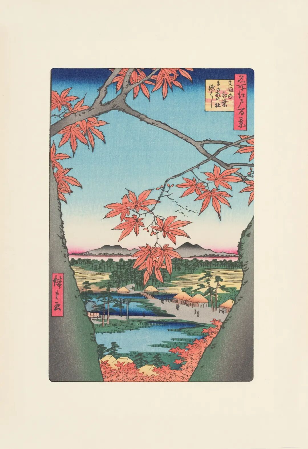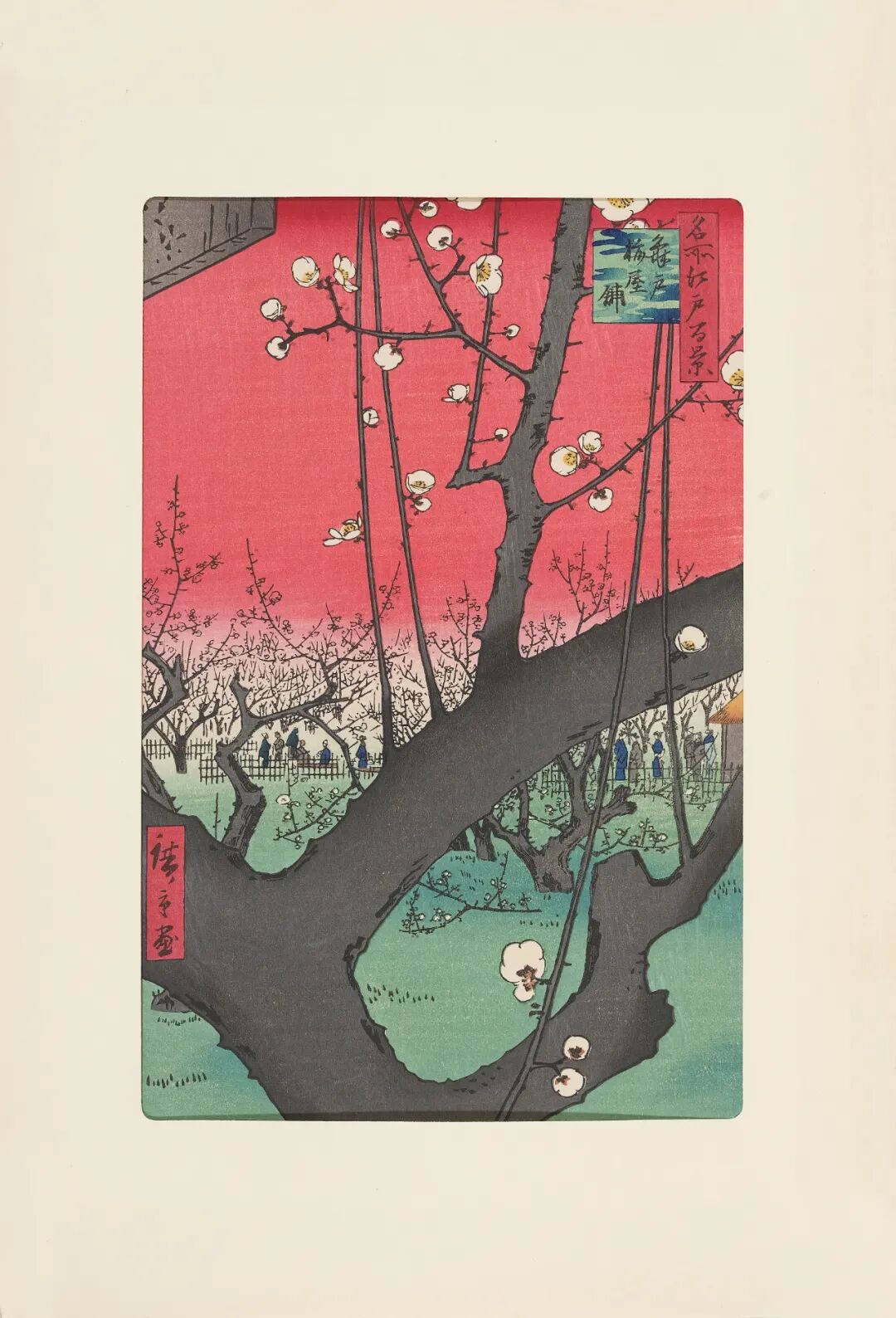 龟户梅园的一株古梅,称为卧龙梅,是江户第一名木,也是文人墨客聚集的胜地。广重采用远近法大胆构图,将卧龙梅大手笔地安排在前景。荷兰后印象派大师梵高曾临摹过此画,因为他被这样的构图,远近感以及图案组合所吸引。的确,西欧没有这种放大前景事物并强调远近感的构图。穿过梅树,您可以看到一些人正在梅园散步,身形显得很小,这当然是一种夸张的手法。本作与另一幅《蒲田梅园》关系紧密。