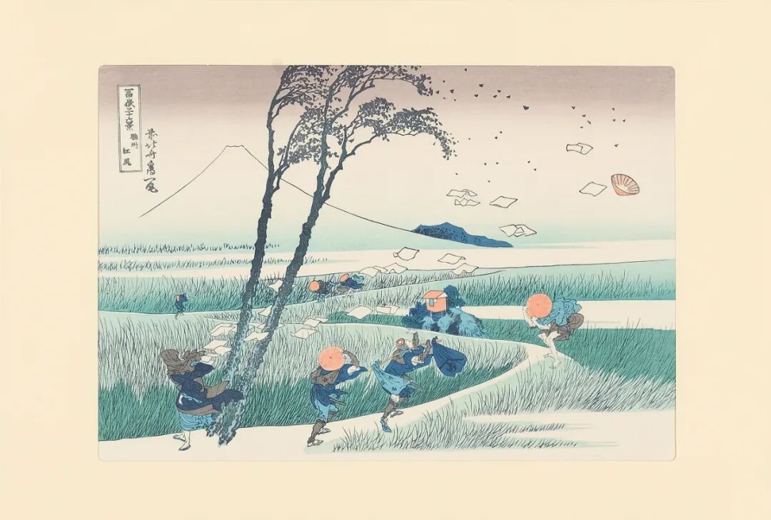 骏州为骏河国的别称,江尻是东海道上的宿场,位于今静冈县静冈市清水区。七名行人在稻田中间的驿路上赶路,突起的狂风造成了混乱。最前方女性手中的纸被风吹起,与树叶、行人的斗笠一起飞舞。宏伟的富士山仅仅是线条勾勒而成,富士山的高远与前景的纷乱形成强烈的对比。这幅画作充分体现了北斋对于瞬间画面的把握,将无形的风真实的描绘出来,让人有身临其境的感觉。风中摇曳的草是雕刻师一根根雕刻出来的,这是一项非常考验技艺与耐心的工作。