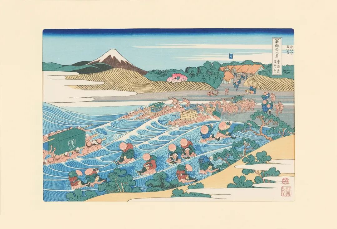 金谷是东海道沿途的驿站,也是大井川的渡河点,位于现在的静冈县岛田市。在江户时代作为旧东海道的涉水渡口而闻名,当时是极难跨越的渡口,葛饰北斋在这里极力表现了想要渡河的旅人的艰辛,也表现出人类在自然面前的渺小富士山峰,矗立着便是一道风景。