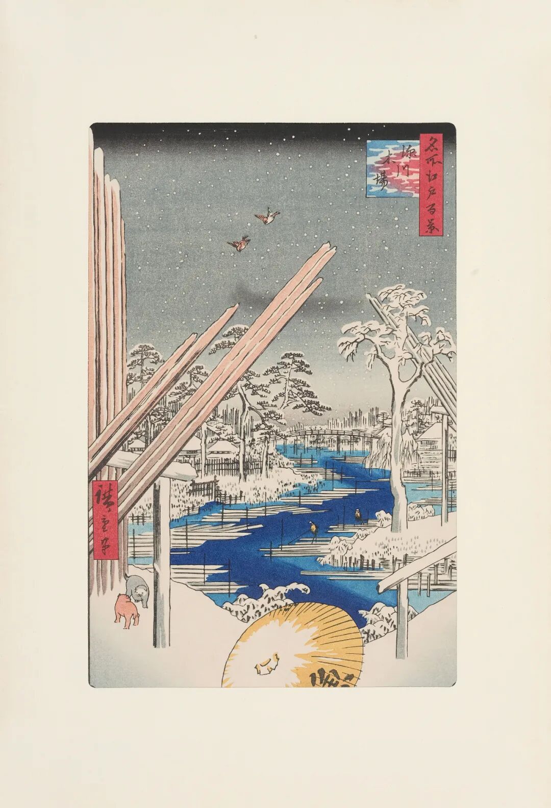 本作描绘了冬日大雪里的深川木场。江户早期,木材作为主要的建筑材料广泛用于江户城的建造,木材厂也因此被安置在距离市中心较近的地方。1641年一场大火将原木材厂化为乌有,幕府颁布政令将木材厂迁移至深川地区。大雪之下的木场没有了往日喧嚣忙碌的景象,厚重的积雪表明大雪已经下了一段时间,天上两只小鸟颤微微的飞过木厂,似乎在寻找避雪的去处,地上两只猫在近景处嬉戏。两名工人身着蓑衣,头戴斗笠,孤零零的工作着。本作以白色为基调,非常简洁,完美的营造了冬日雪景的气氛。