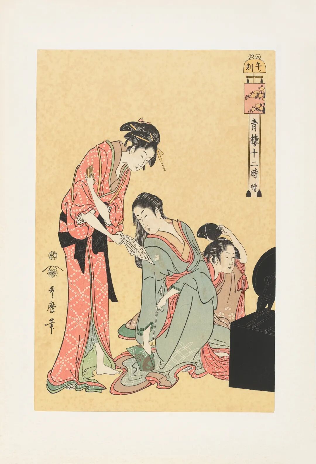 “午之刻”(中午12点),这个时候“昼见世”开始了,还未开始接客的女孩也开始梳妆打扮起来。这幅作品描绘的是花魁梳妆打扮的样子。站立的女子左手持梳,右手拿信给中间的花魁看,像是哪位男子给的情书。正在梳妆的花魁回头看信,手中同时在烟袋里翻找烟草,似乎这样的信件已经习以为常。右边则是很在意自己发型的年幼侍女——秃。(昼见世:在吉原游女们从午后到傍晚在木格子间等待客人)