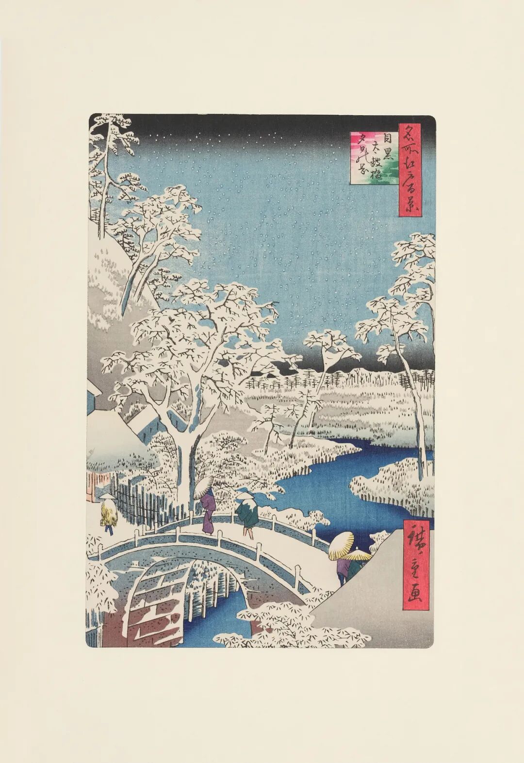 太鼓桥位于东京目黑川,行人坂西端。始建于1769年,是目黑地区著名的景点之一。后因自然灾害而毁,现今的太鼓桥为后修建的。在江户时代,石拱形桥相对少见,此类样式多为模仿中国的桥梁设计而造。独特的结构和造型使其成为江户时代深受游客喜爱的热门景点。本作描绘了冬日雪夜下的太鼓桥,漫天的白雪之下,清丽的河水之上,游客与附近的村民或打伞或身披蓑衣从桥上走过,也有游客驻足观赏美景,丝毫不在乎冬日的寒冷与飘落的雪花。