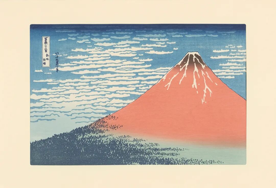 “凯风”一词取自《诗经》,意为吹拂的轻柔南风。本作描绘的是从今山梨县一侧看到的富士山景象。夏日清晨的南风拂过,天空布满波浪状的云朵,富士山顶积雪逐渐消融,整个富士山体被朝霞渲染成红色。左侧是平缓的绿色斜坡。北斋仅仅用密集的短竖线表现森林,增强了山体的威严。本作被称为“赤富士”,为浮世绘中最抽象、最神圣的富士山形象,与《神奈川冲浪里》、《山下白雨》并称为“三大役物”(大役是相扑力士最高等级的统称)。
