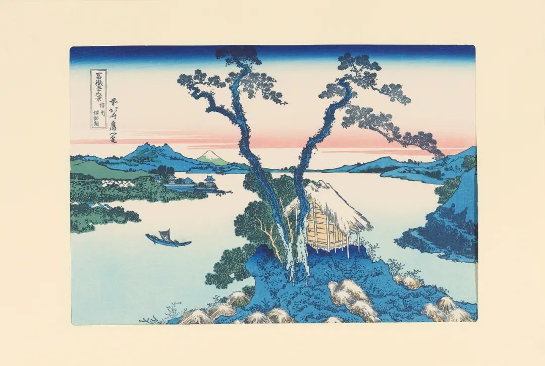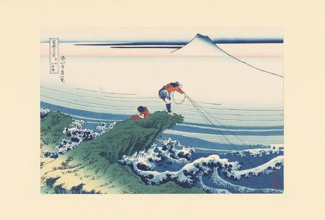 石班泽,又称“鳅泽”,是釜无川和笛吹川汇合后形成的险滩,是富士川的上游,位于今山梨县巨摩郡。一对父子正在兀起的礁石上捕鱼,左侧的孩子带着一个篮子,父亲则身着蓑衣,身体前倾,面对石班泽中的巨浪,他手中的网线被绷得笔直,将石、人、浪之间的张力充分表现出来,突出人与自然永恒对立的主题。画面采用虚实结合的方式,富士山被抽象成轮廓,而礁石和渔人则刻画入微,礁石下湍急的河流如同海浪般翻滚。本作最早使用普鲁士蓝,后期版本改为彩色锦绘。