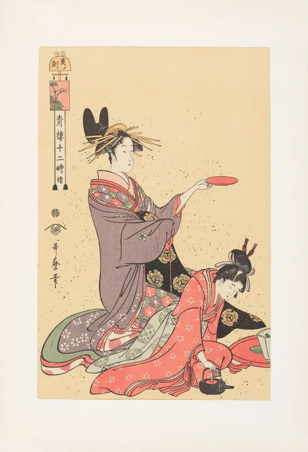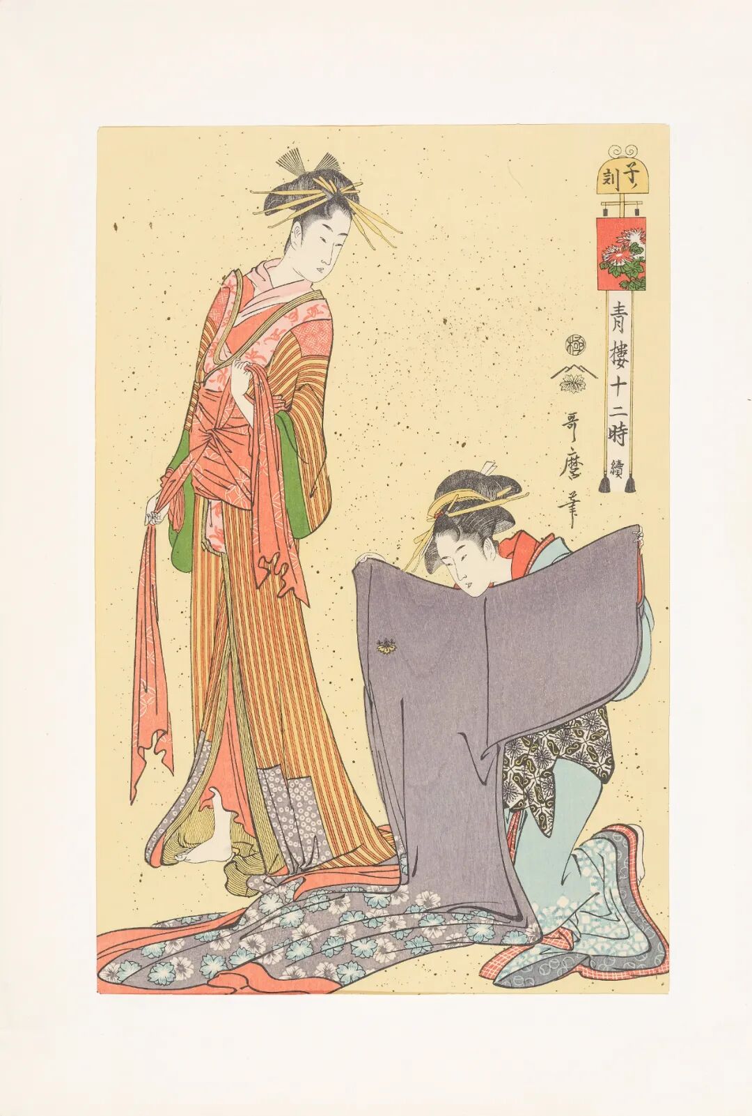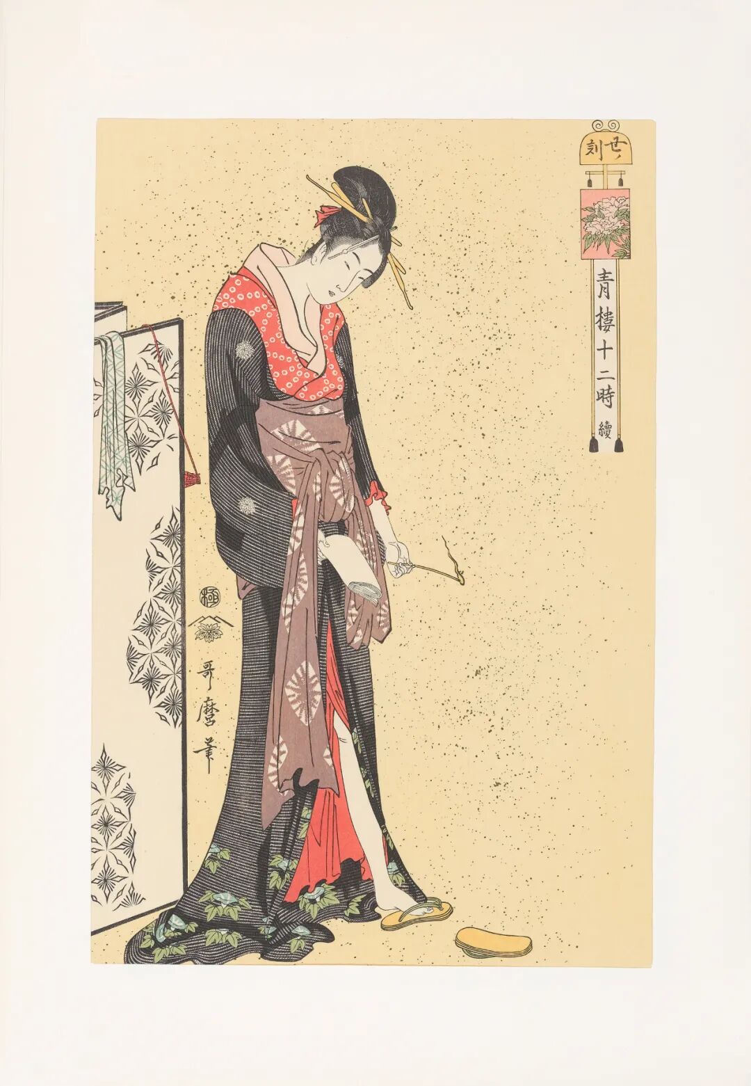 “子之刻”(午夜0点),本作描绘了结束一天工作的游女与叠衣裳的“振袖新造”,褪去外衣换上常服的样子。十头身显得游女身材格外修长优雅,和服的曲线和缓缓的系带像流水一样,下垂的腰带和手的曲线显得更加柔软。
