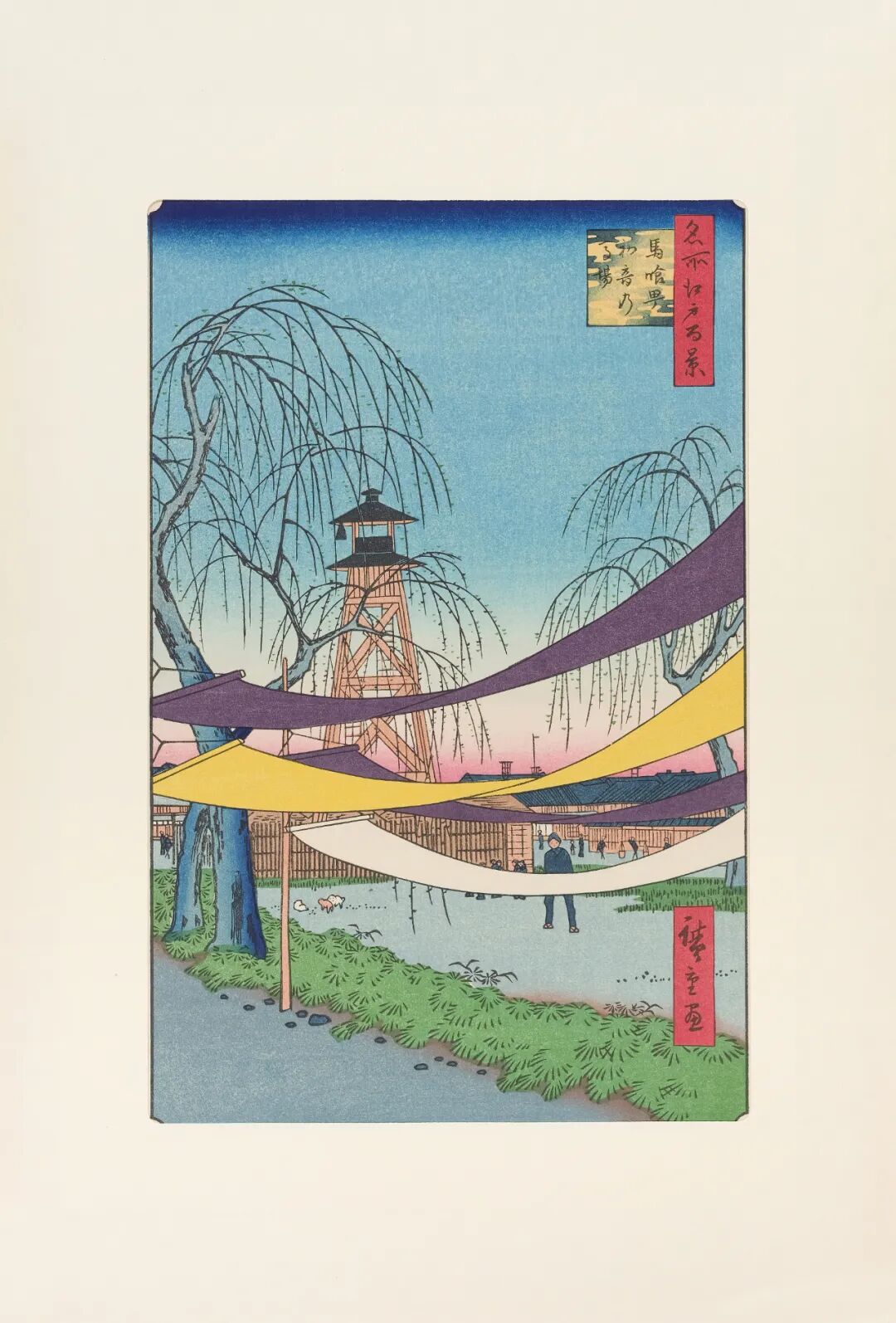 本作描绘了位于旧江户中心的春日景色,此地原本是一个马场,幕府的家老们在此地训练马匹。附近的染色工们利用马场空旷的场地晾干印染的布料。四条布料在春风中轻微飘动,背景中耸立着一座高塔,用于观测火情。旧江户时代,建筑为木质结构,多次发生火灾。绘制本套作品前,江户刚刚发生大火。广重正是基于对火灾前江户无限的迷恋,方绘制了《名所江户百景》。