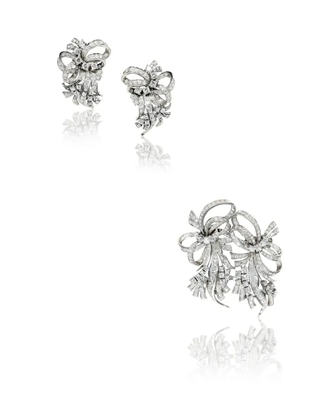 「胸针及吊坠两用款式」胸针及耳环的套组均为双拼(double clip)设计,18K白金钻石胸针浪漫唯美,华丽复古,可拆卸、可双拼任意搭配摇曳生辉。双蝴蝶结与蔓枝交融轻盈飘逸,展现出爱德华时期的浪漫(附原盒)