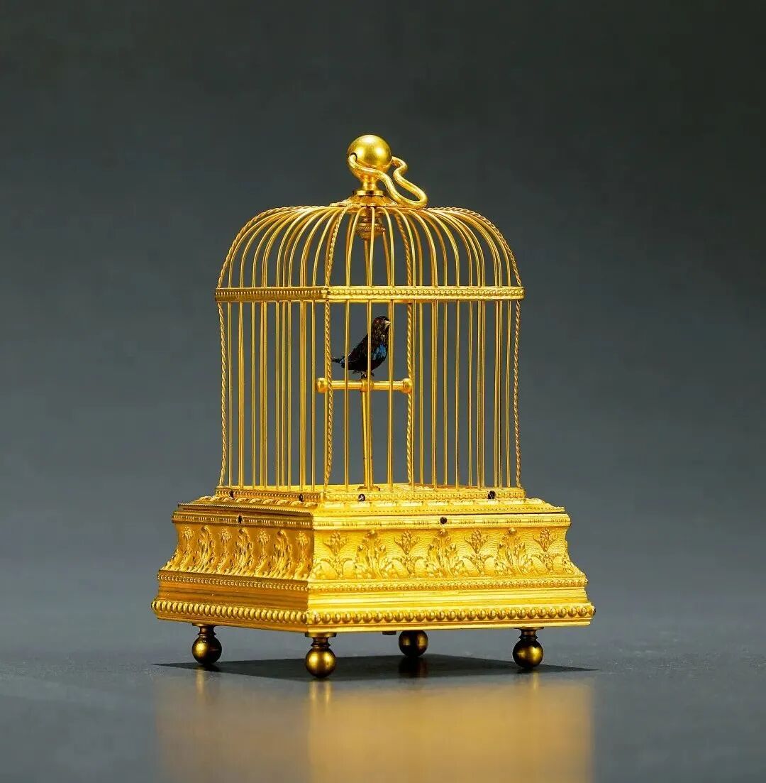 矩形圆顶笼由穿叶板组成,支持在四柱,倾斜的角落安装的瓮末,较低的部分应用叶片主题开孔板,支持爪脚。鸟笼底部的引信运动,利用一系列传统的风箱,哨子和凸轮来模拟鸟鸣,此发明是瑞士法布克里(Fabrique)钟表师努力的杰作,日内瓦专门研究鸣禽的钟表师中最著名的制造商,他们高昂的制造成本使得这些物品极其罕见。制作的珍贵物品中有歌唱的鸟,种类繁多,有吊笼、手表、鼻烟盒、简单的笼子或钟表。