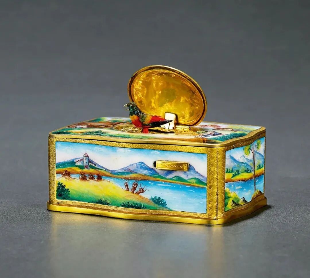 铜鎏金外壳,精美满工珐琅彩绘装饰,四面风景彩绘分别从不同角度描绘了同一幅湖边庄园的场景,顶部彩绘描述了庄园内部贵族闲适的生活场景,上发条后,开启开关,顶盖自动打开,五彩斑斓的雀鸟开始旋转鸣叫,歌声悦耳动听,身体及翅膀有节奏地摆动,活灵活现,栩栩如生。雀鸟羽毛均以天然羽毛制成,色彩鲜艳亮丽。机芯运用超过250个精密零件,工艺精湛高超,展现了十九世纪欧洲钟表技艺的瑰丽。该作品机芯为著名钟表制造商积家(JAEGER-LECOULTRE)制造。(附雀鸟造型钥匙)