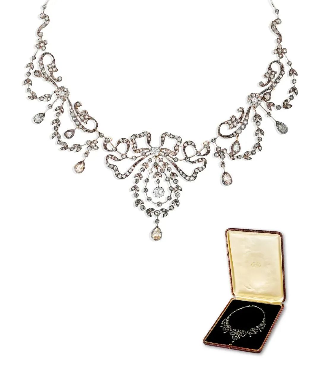 专为西班牙贵族定制的晚宴项链,金银迭打的主体设计采用花卉与卷叶纹饰彰显复古典雅而不失自然精致的浪漫主义,颗颗玫瑰花式老切的钻石镶嵌点缀其中夺目闪耀,中心为立体不规则的蝴蝶结造型轻盈飘逸,下方双环花叶重迭富有丰富的层次感,给人以轻柔曼妙的浪漫感官。盒内印有制造商及品牌印记(附原盒)