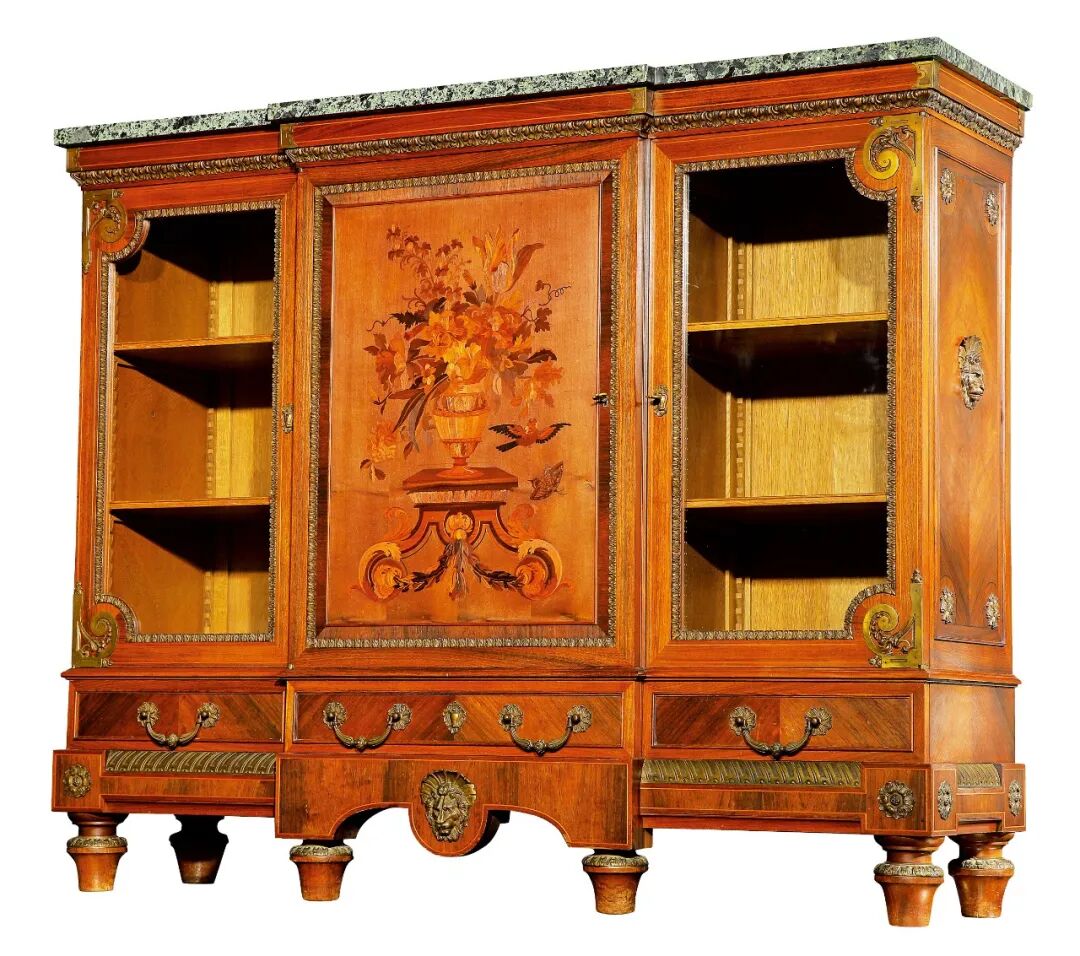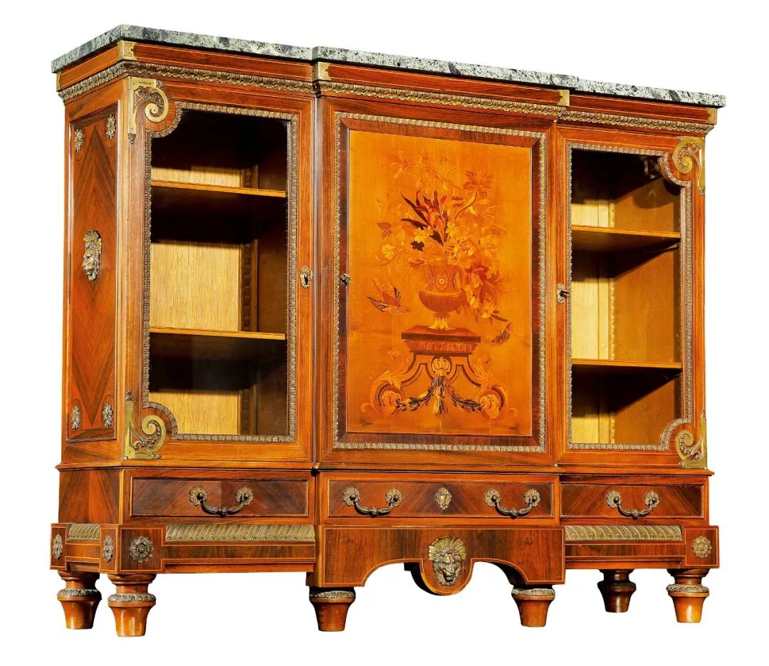 此为贵族专属定制款展示柜,顶级意大利理石台面顶置,柜面主体采用胡桃木、桃花心木、西阿拉黄檀木、黑檀木等多种珍贵木材细木镶嵌而成,描绘出莺歌碟舞、花飞碟忙的浪漫灵动的图案,工匠利用不同木材的原色进行拼接,展现出活灵活现、栩栩如生的美妙场景,体现出工匠的高超镶嵌技艺与匠心独运的创作精神。柜面四角镶嵌铜鎏金浪花纹饰点缀生动大气,中央底部采用铜鎏金立体雕刻象征着权利与地位的雄狮图案,庄重威严,展现出定制者的高贵地位。此对边柜保存完好,体型之大实数少见,难得收藏级品质。