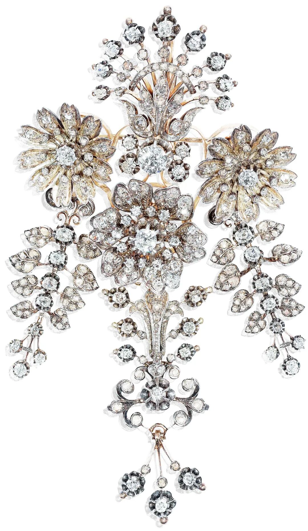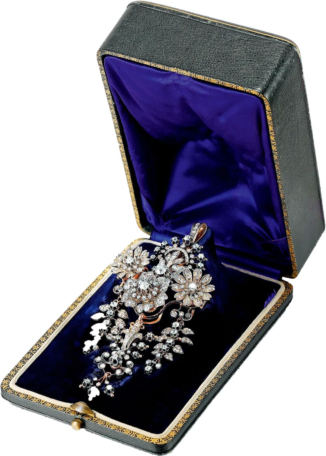 独特花束造型,采用玫瑰式花卉老切,使其在烛光下更加夺目;闪亮颤抖花是维多利亚中期所独有的一种珠宝制作形式,通常做为发饰和胸针。以钻石镶嵌而成的花朵制作完毕后,将其加以精致细小的弹簧后固定在花束的主体上,佩戴者在行走时花朵会有轻微的颤动,从而让钻石更为闪烁动人。镶嵌钻石的运用金银迭打技术,将黄金作为趁底,在上面铺上一层白银并将二者敲打至融为一体,以这种混合的白色金属镶嵌钻石。整整一束花的造型,繁复却又不失层次的分明,分别使用了太阳花,康乃馨和倒挂金钟饰朵形绮丽,顶端带有小颗钻石枝条,是典型的迭加设计灵动曼妙,别具一格,展现浪漫唯美气质。