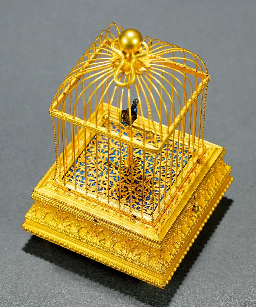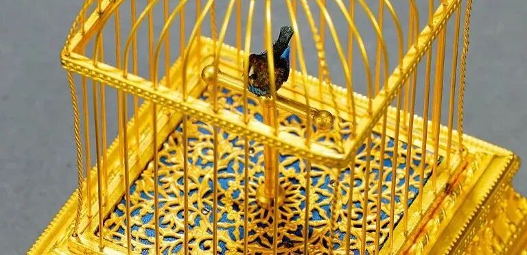 珍稀瑰丽,独一无二;铜鎏金手工镶嵌打造的的鸟笼,精美华丽,笼边轻浮雕雕刻卷叶纹饰、花卉饰经典华美,笼内镂空雕刻硕果枝纹饰精致立体;小鸟羽毛鲜艳选用珍贵的羽毛制作而成生动艳丽,上弦之后唱歌的鸟儿翩翩起舞。鸟笼坐落在一个四边形的底座上,底座上有音乐和机械的运动,并安装在鎏金基座上。
