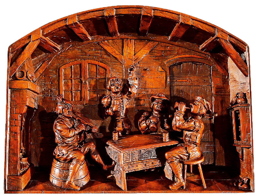 作者将这一作品采用立体雕刻的艺术创作手法将它呈现在胡桃木上,描绘出文艺复兴时期意大利的官员把酒言欢的欢乐场景,作者用精湛细腻的雕刻手法将人物的衣衫层次刻画的鲜明精细,人物神态各异,精准传神烘托出热闹的氛围。