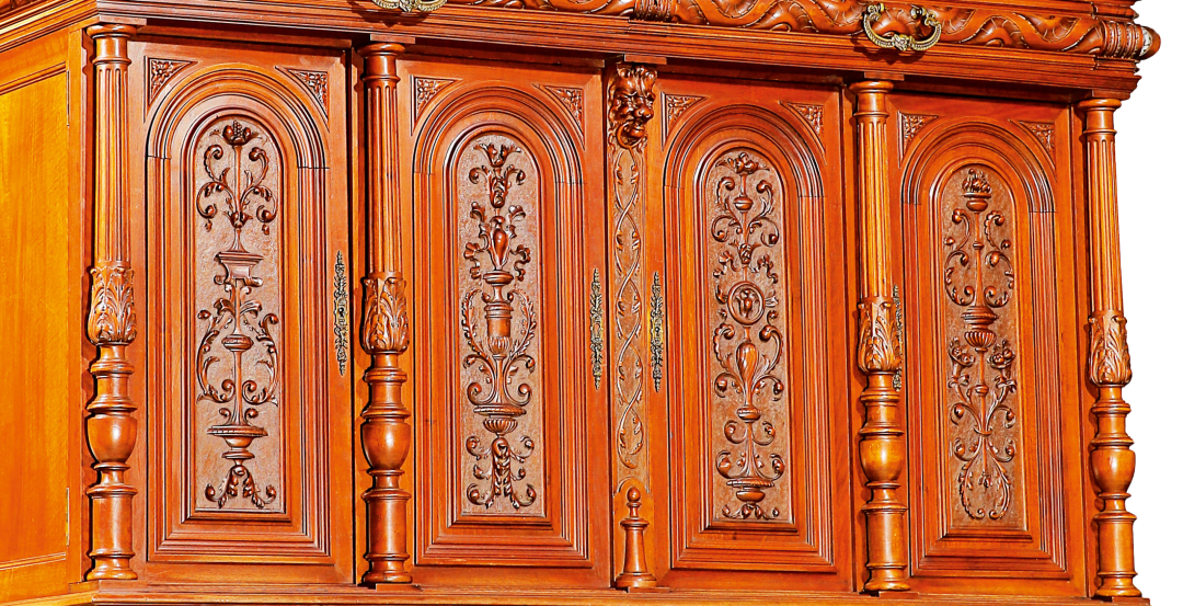 此件为比利时贵族专属定制,胡桃木立体雕刻细腻精湛,线条流畅,立柜两侧罗马柱设计,展现出文艺复兴风格的复古典雅。高柜中央画框式立体画面呈现立体画面的家具为贵族定制中的罕见设计,实属少见,应为欧洲古董家具中独特珍稀的典藏级佳品。