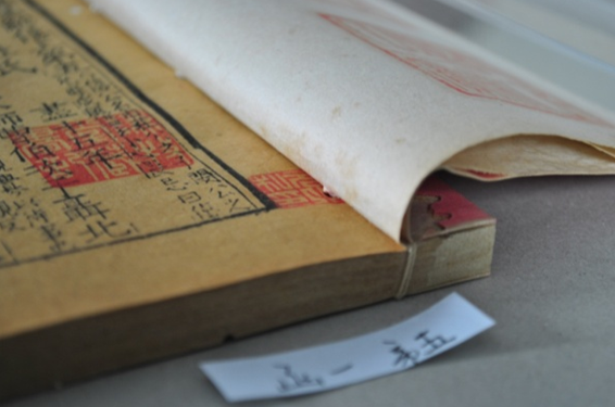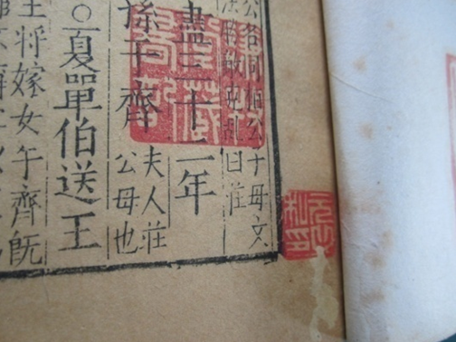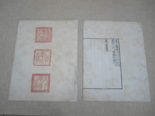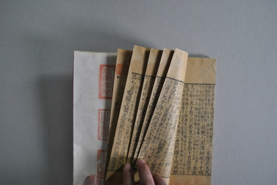 另外,在修复此书时还发现有一个问题,就是此书四函三十二册中有十六册在每书的第一叶紧挨右边栏下方钤有"元之私印"一枚。仔细观察此书经前人修复后,在装订时竟将书眼订在印中"之"字上。开始对此书第三函进行修复时,就发现了此问题,但当时考虑应尽量保持原貌,如果移动书眼位置,随之出现的问题是包角的位置要改变,还要订新的书眼,更重要的是每函中不受印章牵扯的其它册也要改变书眼和包角位置,故修复后仍按原书眼进行了订线。但随着修复的进行,总觉得按原样恢复不妥。因为把书眼订在印中字上和随后的订线,对印中之字都是极大的破坏,印的损伤将达到近三分之一,这显然与古籍修复中所提倡的"片纸只字,要认真对待"的理念相背。故最终决定,为保证文献资料的完整和印章的完好无缺,移动书眼,既使改变书的外观也在所不惜。(见图5—6)![]()