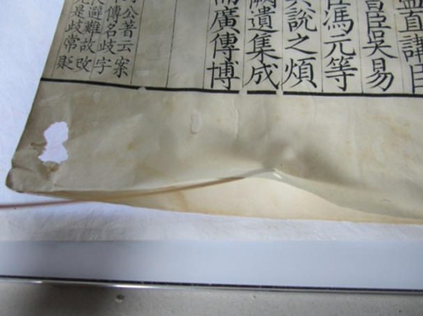 关于"天禄琳琅"的修复,据记载,自其建立后,清宫曾多次对其进行维护,如修补、装帧等。从《军机处镘副奏折》记载中我们发现,大的修复有多次。如道光元年(1821),有关大臣奉命点查昭仁殿"天禄琳琅"藏书,凡属破损虫蛀者统送武英殿修书处修补装潢。此次共修补、装帧书籍187部、3541册(3)。另外,同治十三年(1874)正月起,清宫又对包括昭仁殿、毓庆宫、懋勤殿等多处宫廷藏书进行了清点修缮。此次修书一直持续到光绪二十三年(1897年)(4)。同时,据缪荃孙《琉璃厂书肆后记》记载,穆宗重装"天禄琳琅"时,遇内府修缮不及时,还将宫中藏书发交宫外书肆重新装潢(5)。但据《故宫善本书目》之"凡例"记载,这些被送到民间书肆重装之书"工料俗劣",与乾嘉时之古雅悦目相去甚远(6)。观察前人对"天禄琳琅"的修复,以《春秋经传集解》《孟子音义》《班马字类》为例,我们发现,前人采取的为"连补带衬"修复手法。所谓"连补带衬",就是把糨糊涂抹在书叶背面破损处,之后取一张与书叶大小一致的纸与书叶背面相粘。采用此种方法修复后的古籍毎一次展阍,其书叶破损与衬纸连接位置都会产生摩擦,而每一次的摩擦所产生的力对书叶都是致命的,最后的结果是书叶破损位置周边与书叶脱离并断裂,形成新的破损。故我一直认为,"连补带衬"是不可取的,用此种方法对古籍的修复实际是一种破坏性的修复,不利于古籍的使用,对保存与流传也极为不利。细观前人对以上三部珍籍的修复,我们还发现,前人所使用的糨糊大都极为黏稠,疑为胶与糨糊的混合物,且糨糊堆积严重,造成局部收缩,使修复后的书叶极不平整,纸的柔韧性也发生了变化。那么对此类书如何修比较恰当呢?前些时读到一篇文章,是台北故宫博物院高宜君先生写的《善本古籍的保存修护——以清宫天禄琳琅藏书〈渊颖吴先生集〉为例》一文(7)。此文主要介绍了对"天禄琳琅"藏书《渊颖吴先生集》一书的修复过程。巧的是此书也是经前人修复过,手法也是"连补带衬"。高宜君先生在文中认为:"此一补纸方式可能因收缩不均造成书叶不平整的状态,故在此次的修护中亦将旧衬纸移除"。文中又介绍,为了保证"修护后的书本厚度要尽量与修复前一致,不宜过厚,所以在评估后决定使用质地细密,颜色适中的菠萝宣(一种用台湾当地菠萝树皮为原料抄制的纸张)做为衬纸的原料"。由此我们得知,台湾同行对待前人的修复是将旧衬纸移除,而后使用台湾当地产菠萝宣作为新的衬纸。对于此种修复方法,我认为不合适。我以为,对待前人的修复,我们要区别对待。以此次修复《春秋经传集解》第八册为例,此书虽经前人以"连补带衬"手法修复过,但是糨糊的稀稠方面控制相对较好,故没有出现较明显的折皱现象,所以对本书的负面影响较小。故在修复此书时,这一部分并没有动,衹对新的破损书叶进行了揭开衬纸并对书叶进行修补。同时,对于揭下来的衬纸补好后重新放于原位。我以为,此种修复手法对保持书的原貌无疑是恰当的。(见图1—2)按以上思路我们完成了对此书三十二册的修复,从修复效果看,整体仍保留了修复前旧装的面貌。(见图3—4)![]()