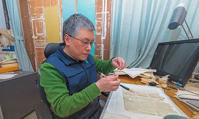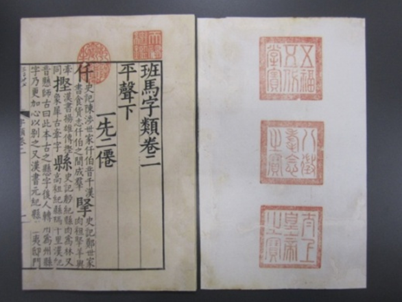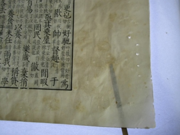 最后,再谈一下对《宋板班马字类》的修复。表面上看,此书似乎也是经前人以"连补带衬"的方法修复过的,且极不平整,有折皱现象,修复后又被虫蛀。但打开书叶后,发现与前两者又有不同。以卷二钤有乾隆三玺的副叶和第一叶为例,发现书叶背面完全不是衬纸,而是一些极破的纸毫无章法地撕成方形随意补缀在书叶背面(见图11)。仔细再观察还有二次修复的痕迹,而且是不揭开原补纸,就在其上又覆一层纸,造成破损处又厚又硬,同时书叶的厚度和韧性也都发生了变化(见图12)。其结果正如北魏人贾思勰在其所著的《齐民要术》中所说的一样,如"瘢疮般硬厚"。此次修复时,采取的办法是揭下这些随意补上去的纸,去掉堆积在书叶上的厚重糨糊(见图13—14),选择与书叶相匹配的纸,对书叶进行重新修复,以恢复书叶的原有平整与韧性。(见图15—16)![]()