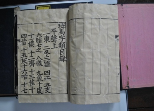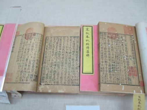 《宋板春秋经传集解》共四函三十二册,四眼线装,粉绢衣,黄签,包角。明嘉靖翻刻宋闽山阮仲猷刻本。《孟子音义》共一册,四眼线装,蓝花锦衣,黄签,包角。明抄本。《宋板班马字类》一部三册,四眼线装,蓝绢衣,黄签,包角。清翻刻宋本。