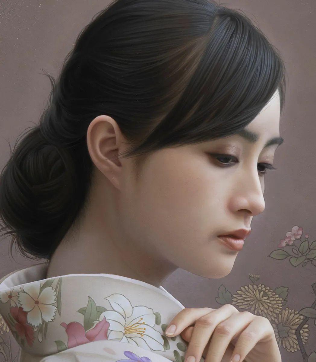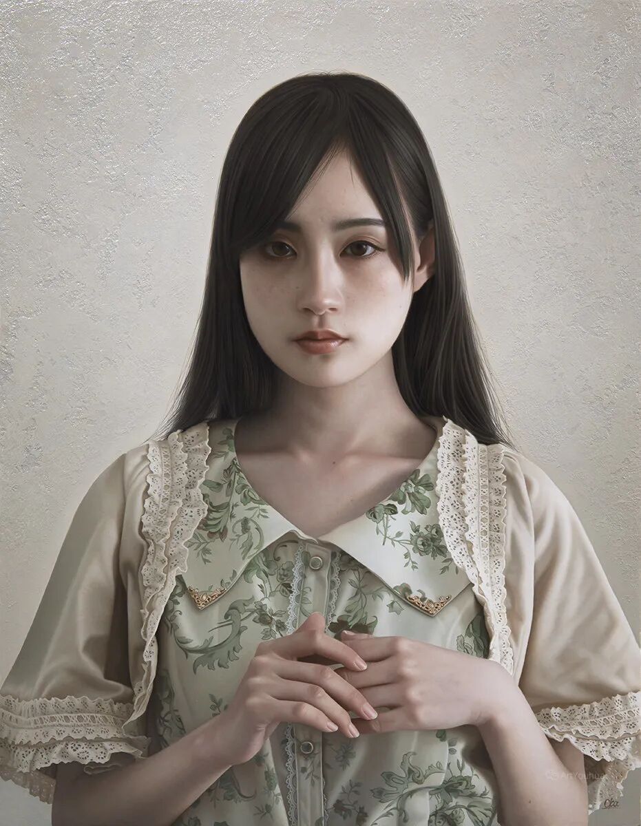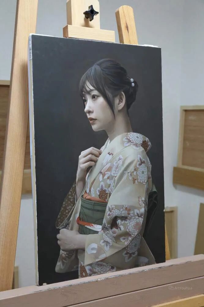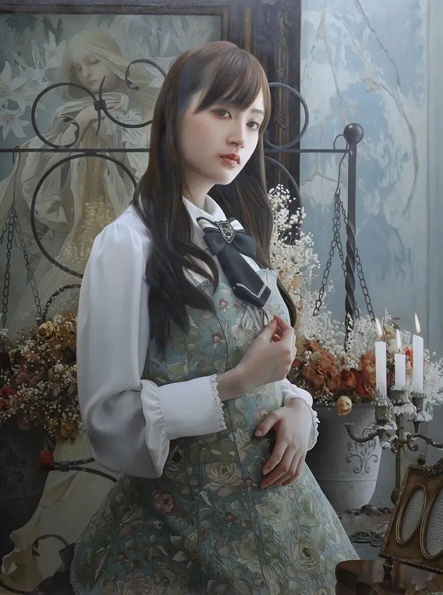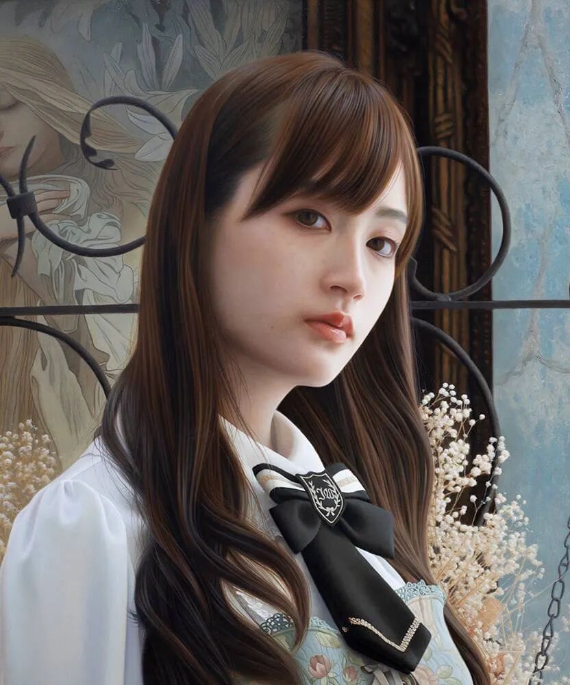 日本80后艺术家冈冈康夫有着极高的写实技巧,在日本的绘画界也是赫赫有名的,为日本超写实绘画第一人,有“日本冷军”之称。冈冈康夫的超写实绘画作品,细腻逼真,以善画少女著称,作品中的少女端庄,优雅高贵。